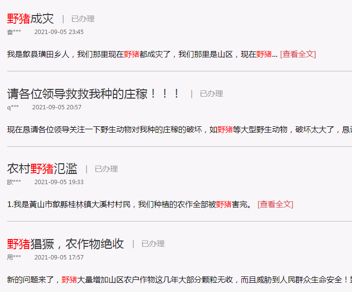 人民網“領導留言板”上,農民有關野豬侵擾問題的投訴明顯高於往年,反映“辛辛苦苦一整年,被野豬一夜毀完”的苦惱。