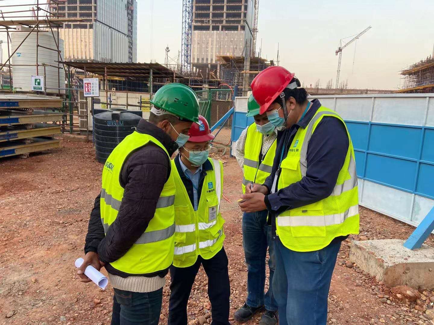 2021年10月,埃及新首都中央商務區項目安全總監兼項目安全部經理劉景昆(右一)在項目建設工地檢查安全生產情況。圖自新華社“一帶一路”故事通訊
