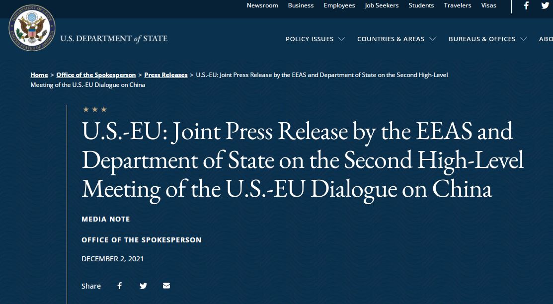 【文/觀察者網 馮智源】當地時間12月2日,美國和歐盟代表在華盛頓舉行了美歐“中國對話”第二次會議。正如此前多家美媒預告的一樣,這份聯合新聞稿對華措辭強硬。不但在中國涉疆、涉藏、涉港、涉台、南海和東海等議題上指手畫腳,美歐還重申會“認真負責地應對與中國的系統性競爭”。