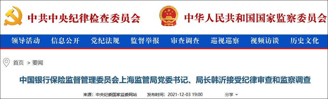 中央紀委國家監委網站12月3日消息,據中央紀委國家監委駐中國銀保監會紀檢監察組、浙江省紀委監委消息:中國銀行保險監督管理委員會上海監管局黨委書記、局長韓沂涉嫌嚴重違紀違法,目前正接受中央紀委國家監委駐中國銀保監會紀檢監察組紀律審查;經國家監委、浙江省監委指定管轄,杭州市監委對其監察調查。