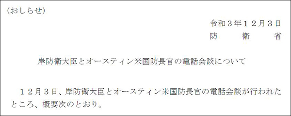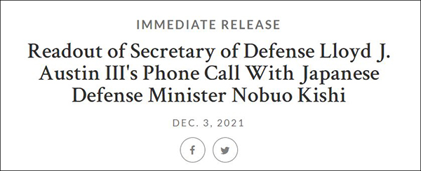 對於奧斯汀與岸信夫通話一事,五角大樓今天發佈了一條很短的新聞通告。通告顯示,奧斯汀強調了他對地區安全與穩定的有關承諾以及美日同盟的持久性。