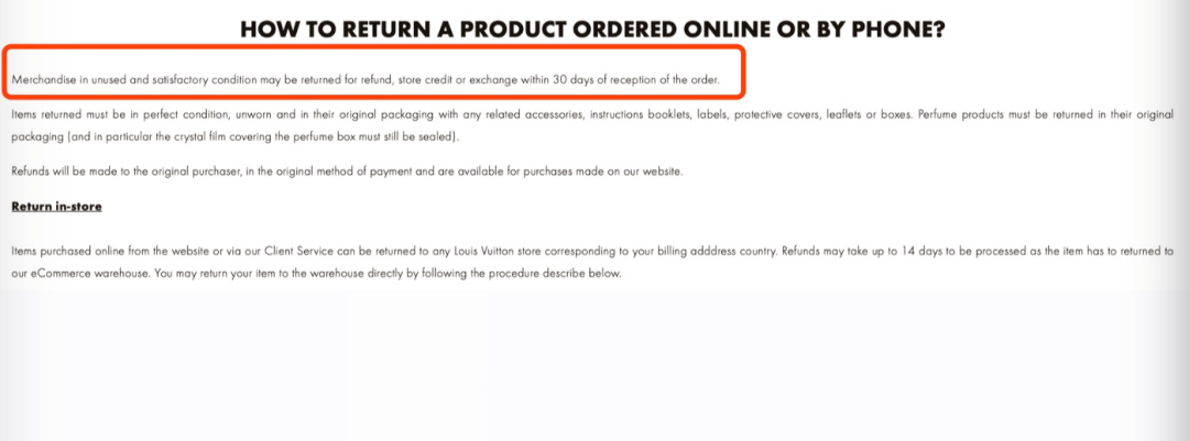 記者查閲以上品牌在國外的退換貨時間發現,儘管提供了“線上退貨”的選擇,但中國消費者被給予的期限是很短的——在英國,迪奧可在60天內退換,香奈兒為30天的期限;在美國及荷蘭官網,路易威登的非特殊產品可在30天內退換。