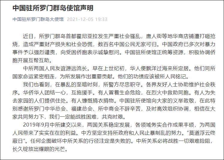 12月5日,微信公眾號“中國駐所羅門羣島大使館”發佈聲明: