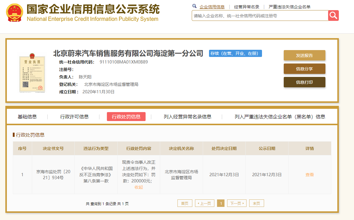 據文件披露:北京市海淀區市場監督管理局,12月3日對北京蔚來汽車銷售服務有限公司海淀第一分公司作出行政處罰。依據是該公司違反了《中華人民共和國反不正當競爭法》第二十條第一款。