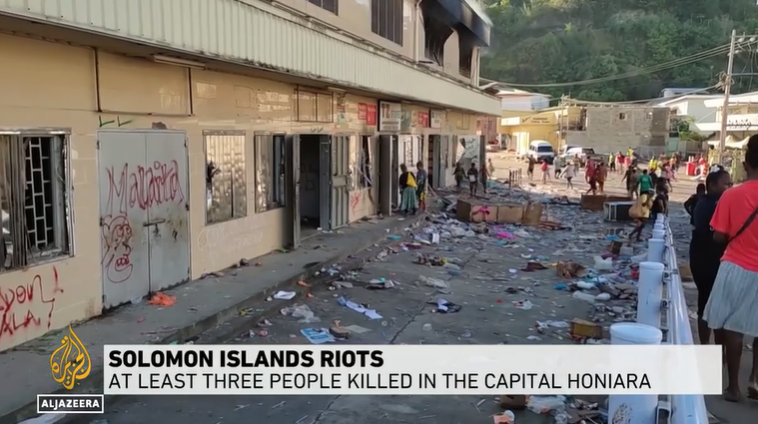 據路透社報道,一週前,所羅門羣島首都霍尼亞拉(Honiara)發生騷亂,暴力示威者從反對黨所在的馬萊塔省來到首都,打砸沿街商鋪,還縱火燒燬多處房屋。4人在持續多日的騷亂中死亡。唐人街等地華商店鋪也未能倖免,遭打砸搶燒,造成嚴重財產損失和社會恐慌,數百名中國公民無家可歸。初步統計經濟損失約達2.27億美元。