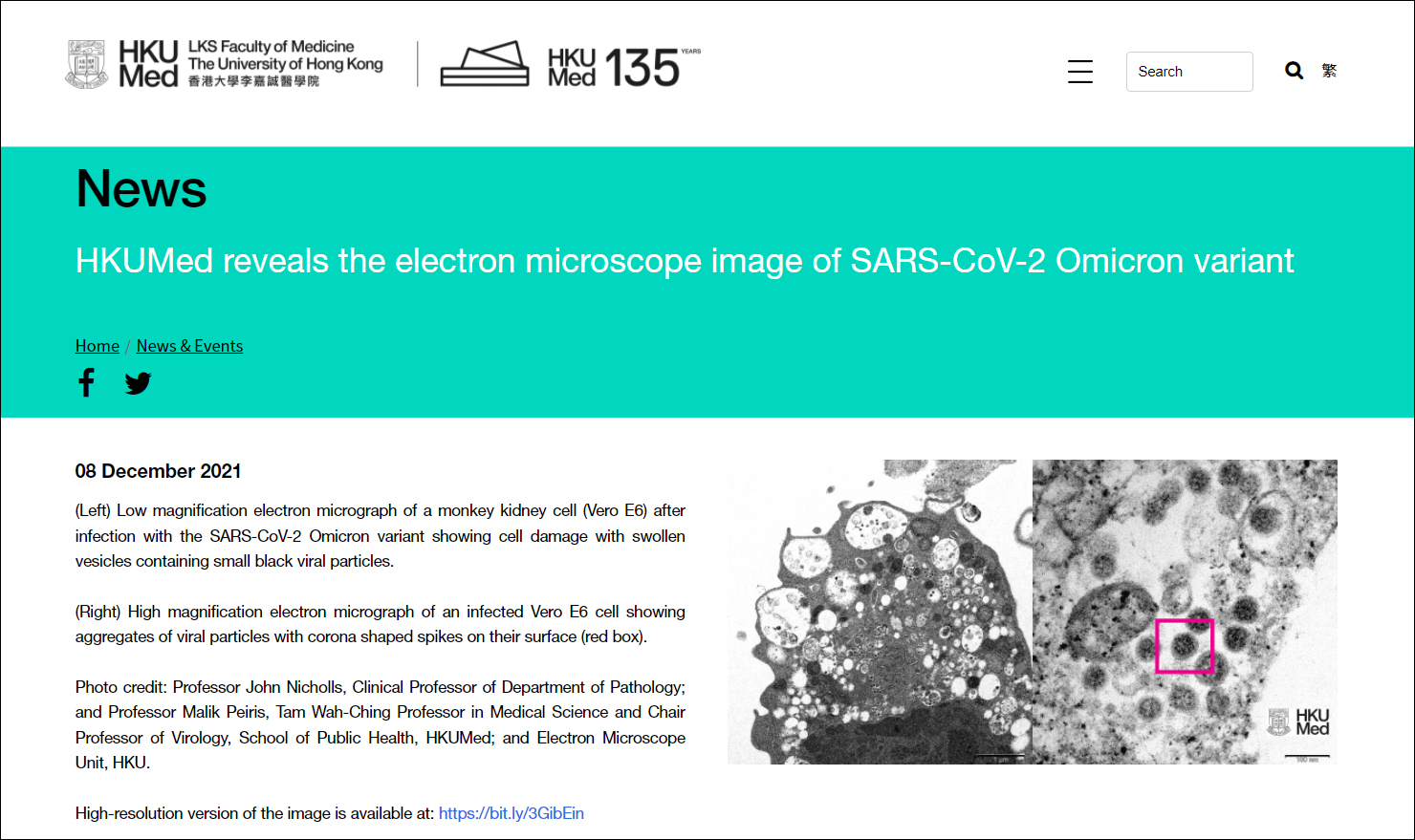 港大醫學院揭示電子顯微鏡下奧密克戎變體“真身”