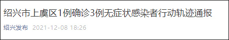 據微信公號“紹興發佈”12月8日消息,浙江紹興市發現四例初篩陽性後經市疾控中心和專家組判定為1例輕型確診和3例無症狀感染者病例,現將有關軌跡通報如下,若與下列病例和感染者有時空交集,請主動向社區報告。