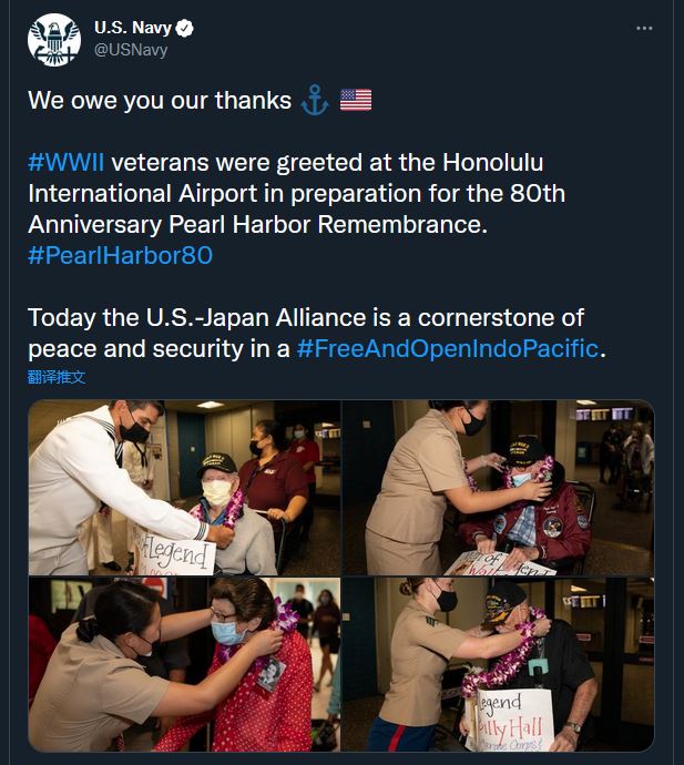 這條預告性質的推文一開始感謝了老兵:“我們欠你們一聲謝謝。我們在檀香山國際機場歡迎二戰老兵,為珍珠港事件80週年紀念做準備。”