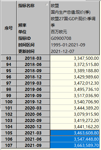12月7日,歐盟統計局公佈了最新GDP數據,歐盟27國前三季度現價季調GDP總量為106746.47億歐元。