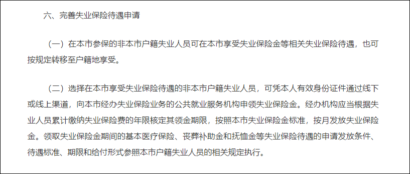 上海市人社局2020年8月發佈《關於進一步做好本市失業登記、失業保險有關工作的通知》,文內截圖