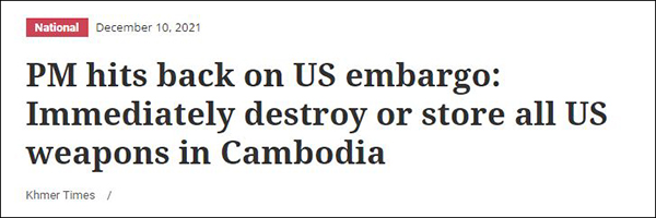 據柬埔寨主流英文媒體《高棉時報》(Khmer Times)、《柬中時報》等多家當地媒體12月10日報道,對於美國此前宣佈對柬埔寨實施武器禁運和一系列出口限制,柬埔寨首相洪森當天命令該國所有武裝力量“如果找到美製軍事裝備就丟在倉庫或直接銷燬”。