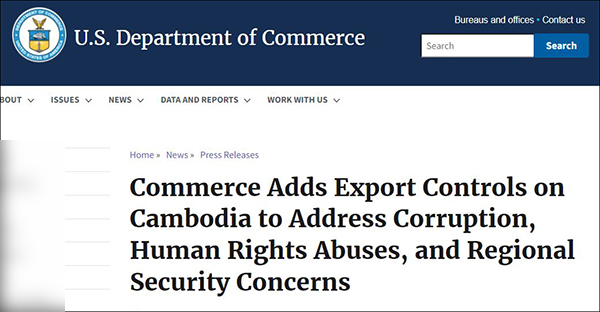 美國商務部網站本月8日發表聲明:因“柬埔寨允許中國擴大在該國的軍事存在”及柬埔寨存在所謂“腐敗”、“人權問題”等,美方宣佈對向柬出口和再出口美敏感物項施加新限制措施。同時美國國務院也宣佈對柬實施武器禁運。