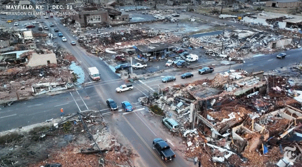 貝希爾在記者會上介紹,梅菲爾德市就在龍捲風的路徑上,這座城市“被摧毀了”。“我以前從未見過這般情形。你能看到建築殘骸、房頂等等掛在樹上——如果樹還沒被吹倒的話。有些地區的受災情況難以用語言形容,這是肯塔基州歷史上最艱難的一夜之一。”