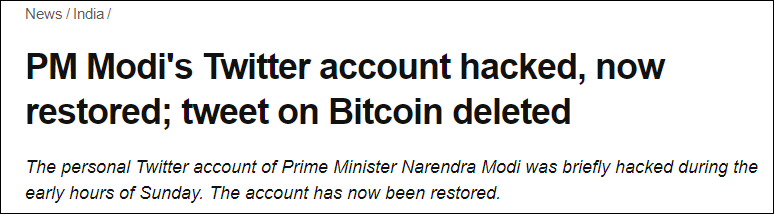 印度媒體《今日印度》報道稱,當地時間12月12日凌晨,擁有7300萬粉絲的印度總理莫迪的個人推特賬號被黑,期間還發布了一條比特幣的推文。