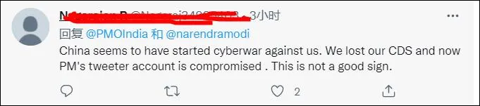 “中國似乎已經對我們發起了網絡戰爭。我們已經失去了我們的國防參謀長,現在總理的推特賬號又被入侵。這不是一個好信號。(注:12月8日,印度一架直升機墜毀,包括印國防參謀長拉瓦特上將在內的多人在事故中不幸罹難。)”