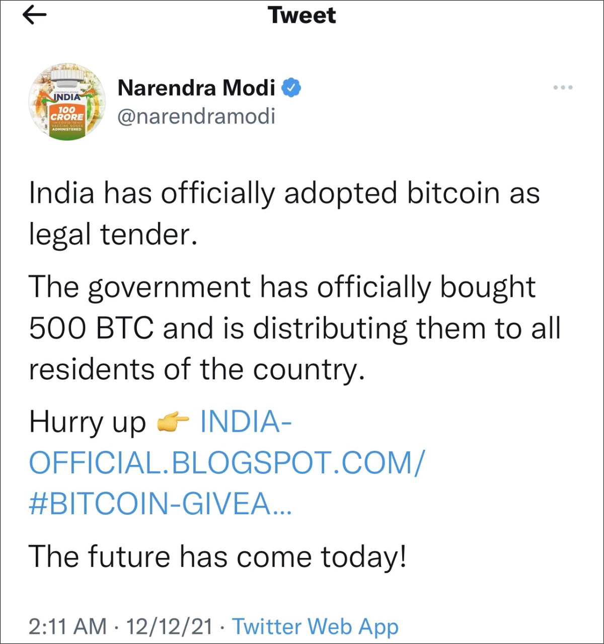 莫迪賬號被黑期間發佈這條推文寫道:“印度已正式採用比特幣作為法定貨幣。政府已經購買了500個比特幣,並將發給全國居民。今天,未來已經來臨。”