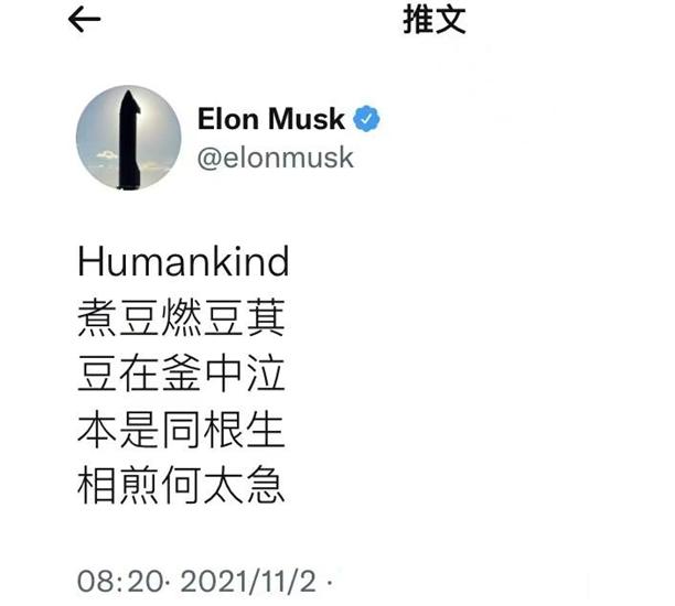 他在推文中寫道:“Humankind(人類)”,然後附上了曹植的《七步詩》:“煮豆燃豆萁,豆在釜中泣,本是同根生,相煎何太急。”