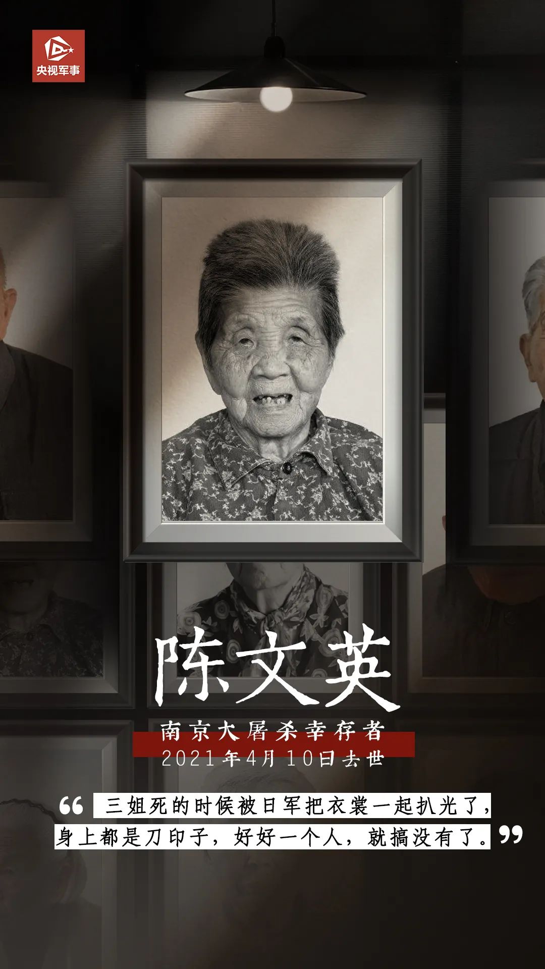 2021年4月10日,南京大屠殺倖存者陳文英去世。