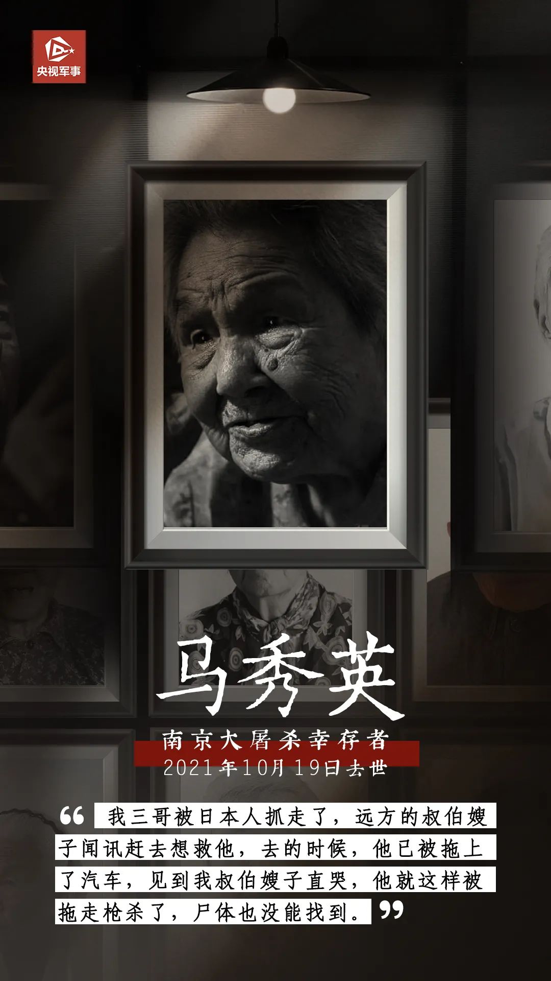 2021年10月19日,南京大屠殺倖存者馬秀英去世,她是今年去世的第11位倖存者。