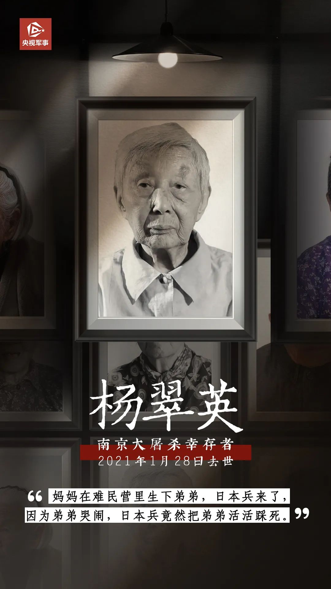 2021年1月28日,南京大屠殺倖存者楊翠英去世,她是今年去世的第一位倖存者。