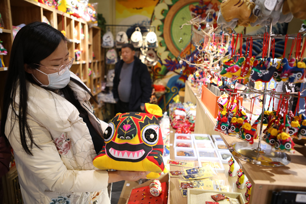 2021年12月3日,山東省莒縣,市民在選購虎生肖玩具。明年是中國農曆虎年。在莒國古城,許多商家將生肖虎圖案的玩具、飾品等懸掛在顯眼位置,供應節日市場。 圖源:IC photo