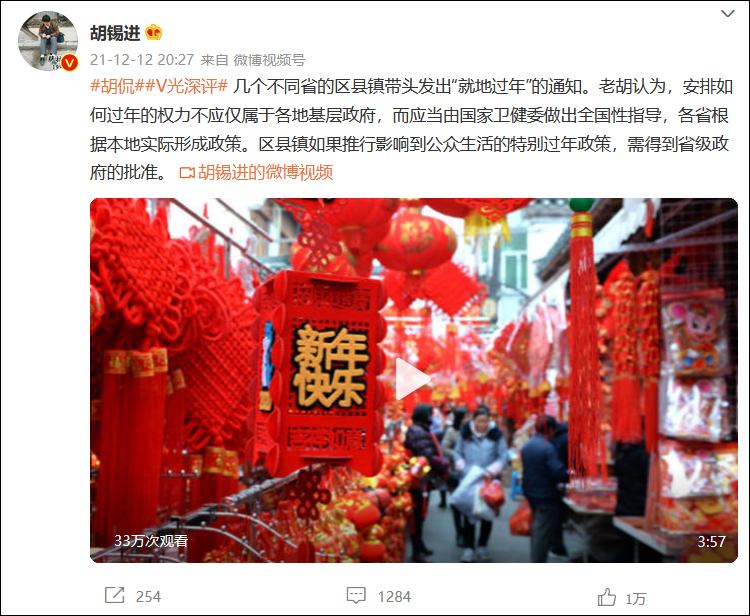 對於各地“就地過年”的通知,《環球時報》總編輯@胡錫進 12日發微博稱,他認為,安排如何過年的權力不應僅屬於各地基層政府,而應當由國家衞健委做出全國性指導,各省根據本地實際形成政策。區縣鎮如果推行影響到公眾生活的特別過年政策,需得到省級政府的批准。