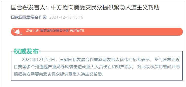 微信公眾號“國家國際發展合作署”12月13日消息,2021年12月13日,國家國際發展合作署新聞發言人徐偉向記者表示,我們注意到近日美國多個州遭遇嚴重龍捲風襲擊造成重大人員傷亡和財產損失,對此表示深切慰問並願根據美方需要向受災民眾提供緊急人道主義幫助。