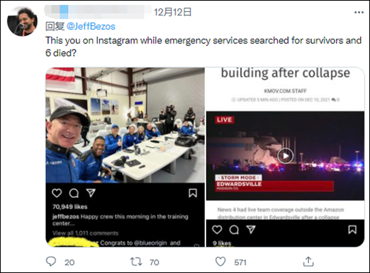 目前尚不清楚貝索斯本人是否參加了這場聚會。但是,11日上午,就在人們還在緊急救援倒塌倉庫下的被困者時,貝索斯還在社交媒體上分享他的太空探索公司藍色起源(Blue Origin)的合影,還配文稱“訓練中心的快樂團隊”。