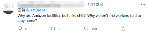 直到當地時間11日晚,災難發生24小時後,貝索斯才終於姍姍來遲地發佈推特稱很“心碎”:“愛德華茲維爾的消息是悲慘的。我們為失去夥伴而心碎,我們的思念和祈禱與他們的家人和親人同在。 ”