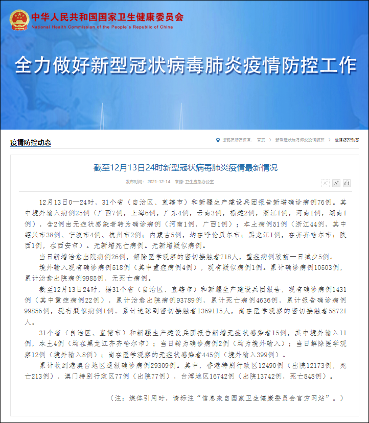 據國家衞健委官網12月14日消息,12月13日0—24時,31個省(自治區、直轄市)和新疆生產建設兵團報告新增確診病例76例。其中境外輸入病例25例(廣西7例,上海6例,廣東4例,雲南3例,福建2例,浙江1例,河南1例,湖南1例),含2例由無症狀感染者轉為確診病例(河南1例,廣西1例);本土病例51例(浙江44例,其中紹興市38例、寧波市4例、杭州市2例;內蒙古5例,均在呼倫貝爾市;黑龍江1例,在齊齊哈爾市;陝西1例,在西安市)。無新增死亡病例。無新增疑似病例。