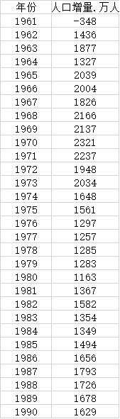 數據顯示,受三年自然災害影響,1960年、1961年總人口連續兩年下降。1962年迅速反彈,當年淨增人口達到了1436萬人。其後,從1963年開始到1975年,年淨增人口均超過了1500萬人。1976年後淨增人口數量雖然有所下降,但也都在1100萬以上。尤其是,從1986年到1990年淨增人口均超過了1500萬人。進入上世紀九十年代,淨增人口也一直保持在1000萬以上。