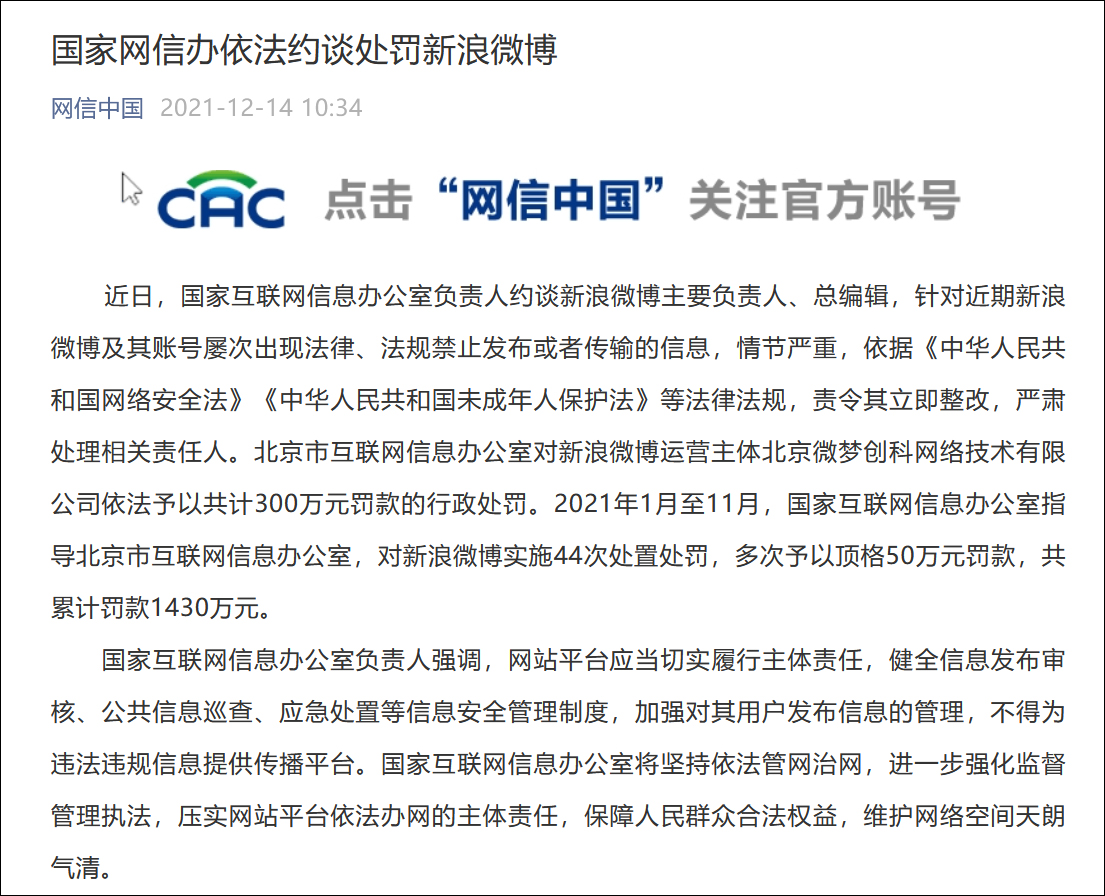 國家網信辦依法約談處罰新浪微博,2021年1月至11月累計罰款1430萬元