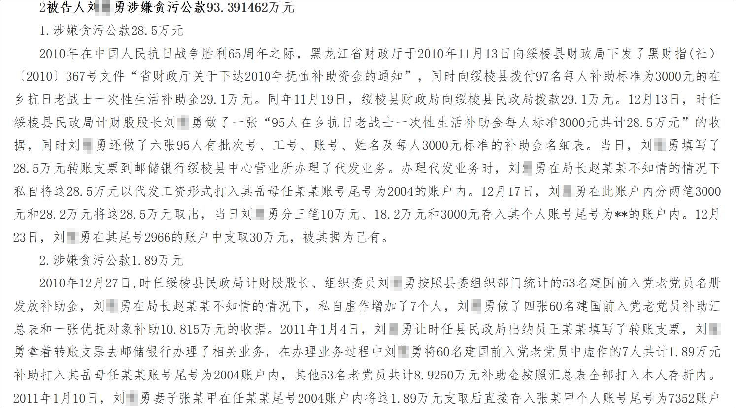 據12309中國檢察網消息,曾在黑龍江綏稜縣多個行政部門任要職的劉某勇現在正面臨綏稜縣人民檢察院的兩項指控。據檢察院審查查明,劉某勇涉嫌挪用公款1100萬元、貪污公款93萬餘元,其中,28.5萬的“在鄉抗日老戰士一次性生活補助金”被貪污。
