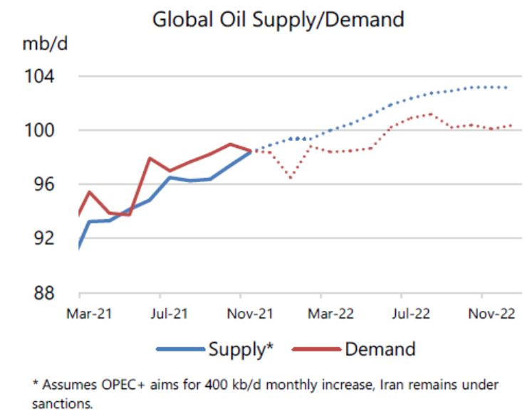OPEC+在週一的報告中表示,儘管奧密克戎變種阻礙了經濟復甦的進程,但來自這一新毒株的的影響是“ 温和而短暫的(mild and short-lived)”。OPEC+將明年第一季度的石油需求預期上調了110萬桶/天,並預計在2022年第三季度,需求將達到1億桶/天。