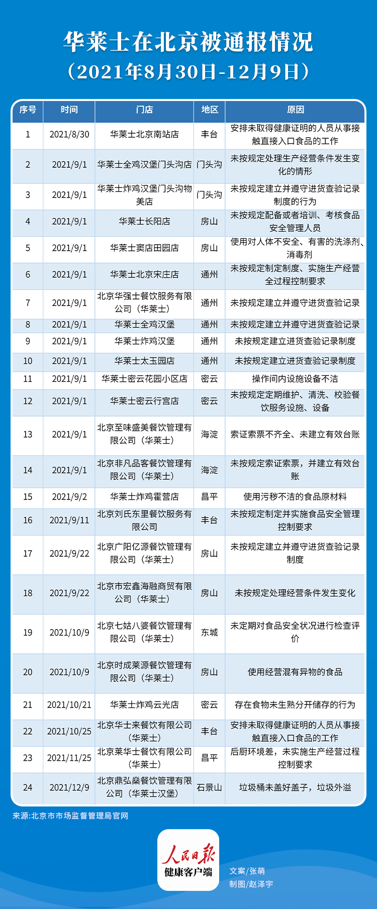 12月13日,健康時報梳理北京市市場監督管理總局發佈的《全市餐飲業大檢查情況通報》發現,自今年8月30日北京市市場監督管理總局官網公佈全市餐飲業安全檢查以來,截至到12月13日,在近200條通報信息中,北京不同的華萊士餐廳共計被通報24次,僅9月1日一天,就有13家門店被通報。被通報門店共涉及豐台、門頭溝、房山、通州、密雲、海淀、昌平、東城、石景山9個區。