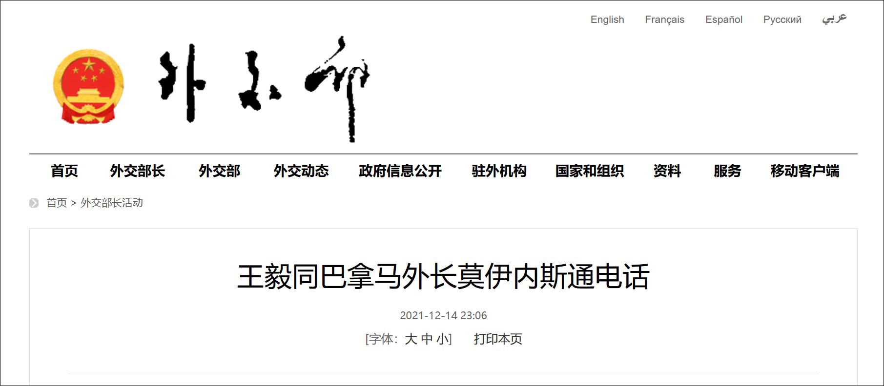 據外交部網站消息,2021年12月14日,國務委員兼外長王毅應約同巴拿馬外長莫伊內斯通電話。