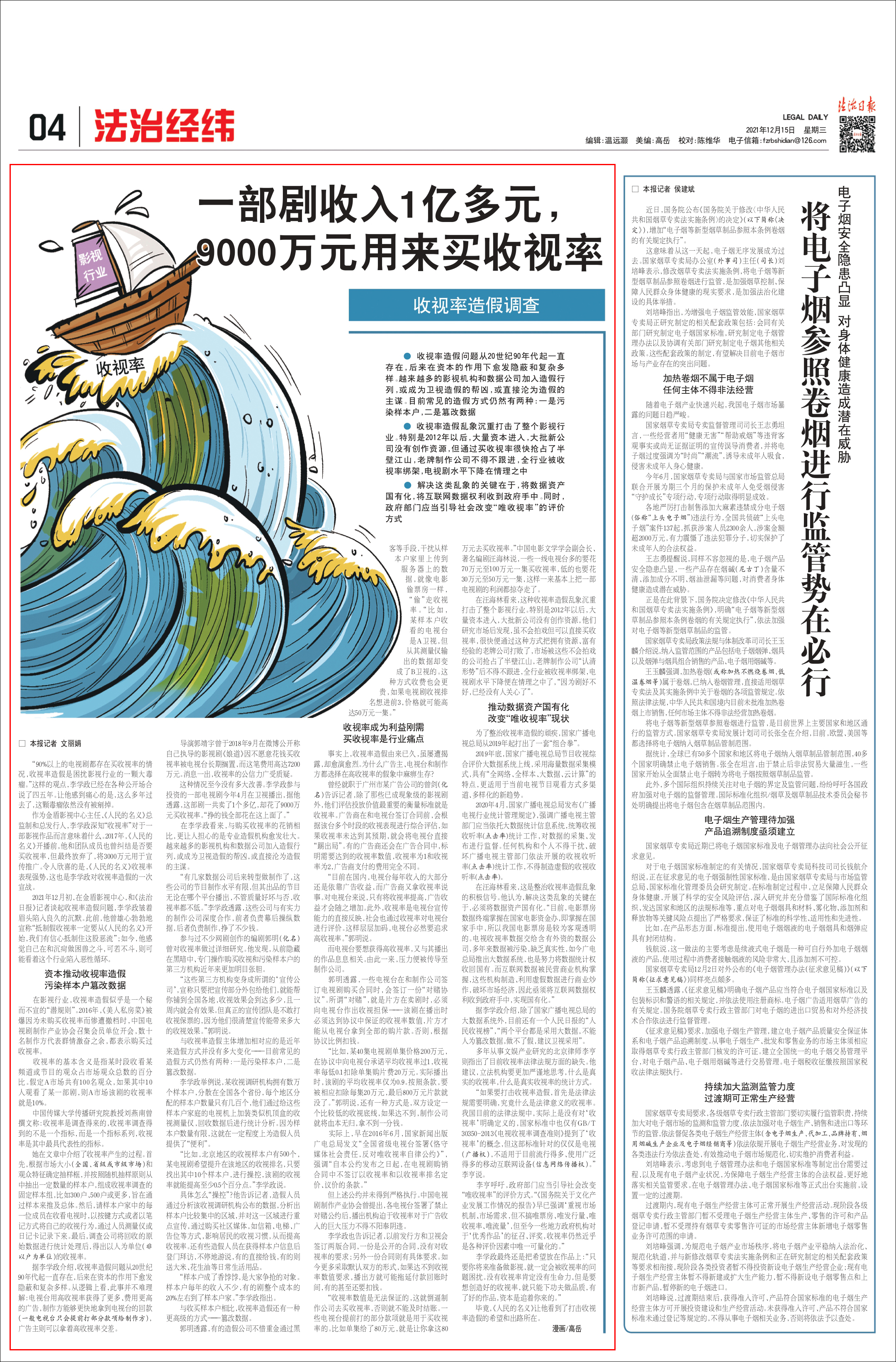 多年從事文娛產業研究的北京律師李亨則指出了目前收視率法律法規方面的缺失。他建議,立法機構要更加嚴謹地思考,什麼是真實的收視率,什麼是真實收視率的統計方式。