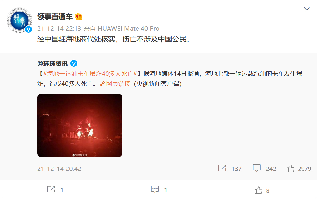 海地油罐車爆炸事故已致60人死亡,外交部領事保護中心:不涉及中國公民