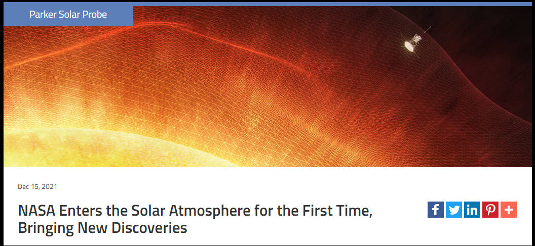 據美國宇航局官網12月15日介紹,2021年4月,在帕克第八次飛越太陽期間,在太陽表面上方約810萬英里(1303萬公里)處遇到了特定的磁性和粒子,標誌着它首次越過阿爾文臨界表面,進入了太陽大氣層。