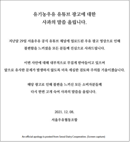聲明中,首爾牛奶表示:“我們真誠地向所有因YouTube廣告而感到不安的人道歉。我們懷着沉重的心情接受這件事,並將對內部進行審查,特別注意防止今後發生類似事件。”