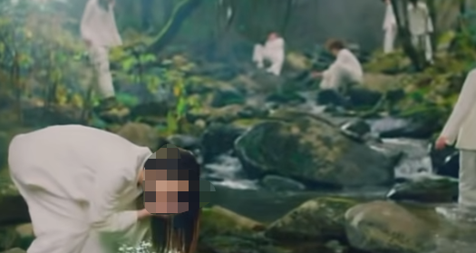 該廣告視頻顯示,一名男子揹着巨大的攝像機,徒步穿過樹林。忽然,畫面裏出現了一羣穿着白色服裝,飲用山泉水的年輕女性。