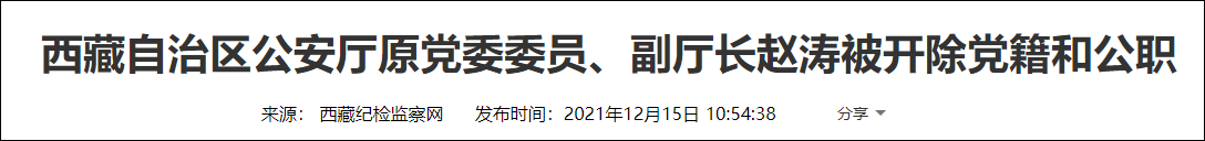 西藏紀檢監察網12月15日消息,日前,西藏自治區紀委監委對自治區公安廳原黨委委員、副廳長趙濤嚴重違紀違法問題進行了立案審查調查。