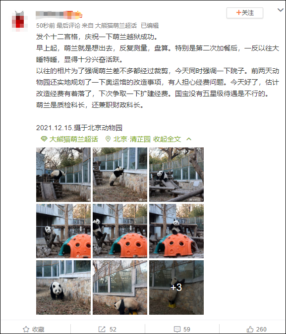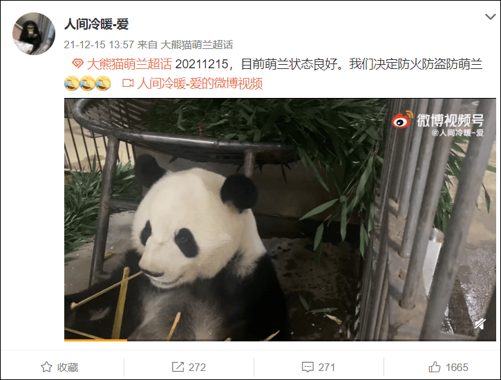 疑是北京動物園飼養員的微博網友@人間冷暖-愛 發表微博表示:“目前萌蘭狀態良好。我們決定防火防盜防萌蘭”。還附上一則萌蘭一邊聽着“訓斥”,一邊愜意地啃食竹子的視頻。