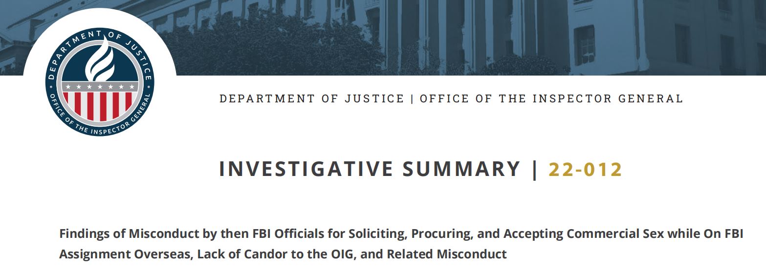 報告指控稱,四名聯邦調查局探員涉嫌在海外執行任務期間拉皮條,並接受性服務。而在接受調查時,他們還撒謊了。“在檢察長辦公室調查和測謊期間,他們對自己與性服務人員和其他不當行為缺乏坦白。”
