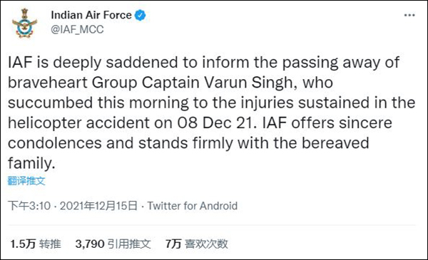 12月15日,印度空軍(IAF)在社交媒體發佈消息稱,在8日印度空軍直升機墜毀事故中唯一倖存者、機長瓦倫·辛格(Varun Singh)已於當天上午不治身亡。