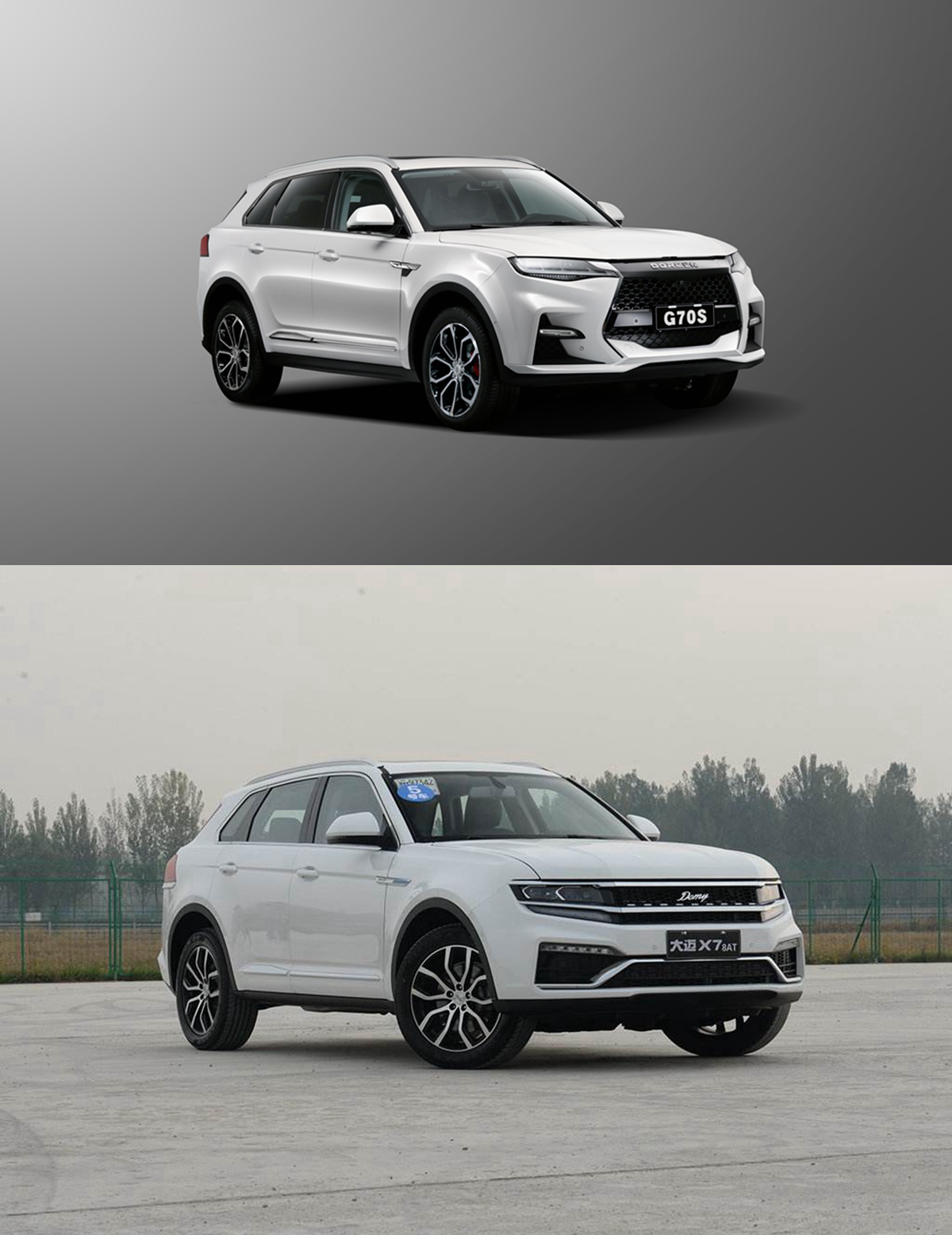 如首發上市的大乘G70s,不僅有着與眾泰大邁X7近似的外觀、完全一致的車身尺寸,其來自航天三菱的2.0T發動機、8AT變速器參數,甚至車型的配置水平,都與後者如出一轍。