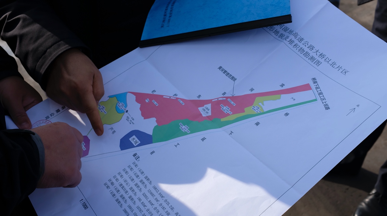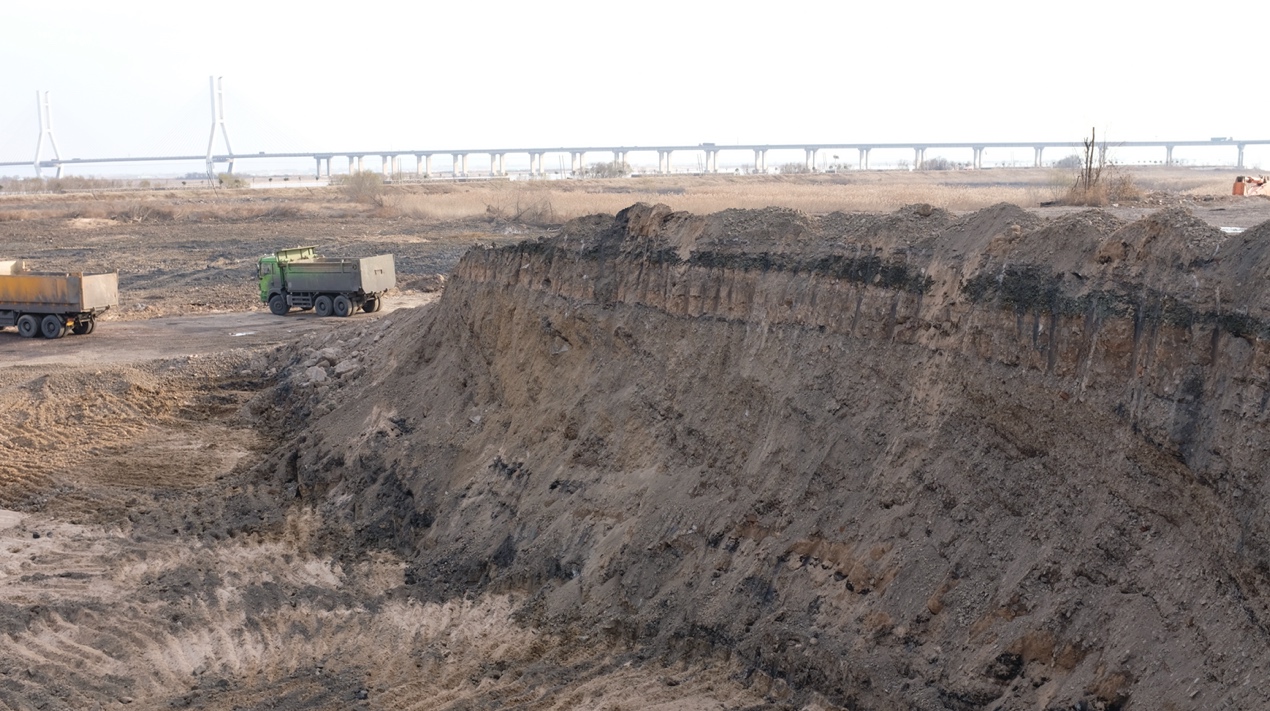 挖開的固體廢物深達數米,遠處是龍門黃河大橋。