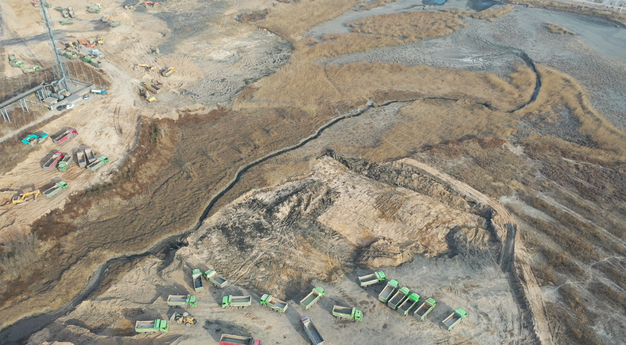 12月17日,在陝西黃河濕地省級自然保護區實驗區內,韓城市組織工程車輛對區域內的固體廢物進行清理。 航拍圖