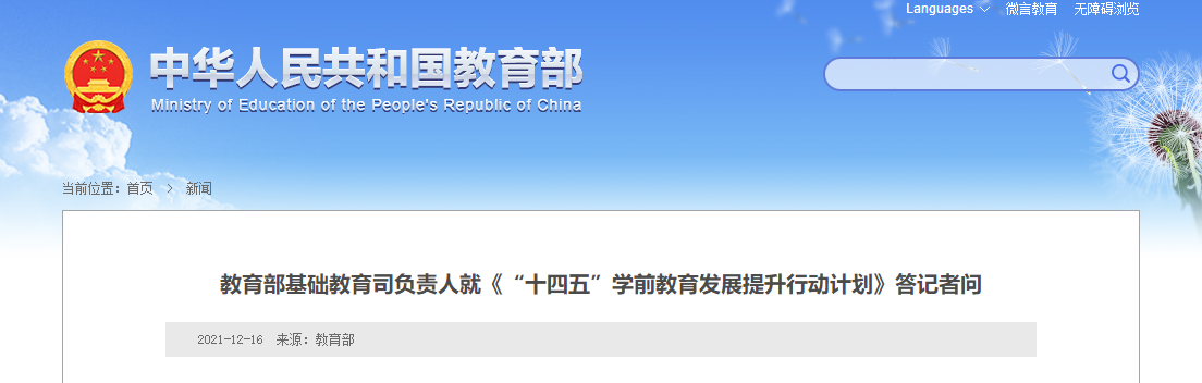 教育部網站12月16日消息,近日,教育部、國家發展改革委、財政部等九部門印發了《“十四五”學前教育發展提升行動計劃》(以下簡稱“學前提升計劃”)。