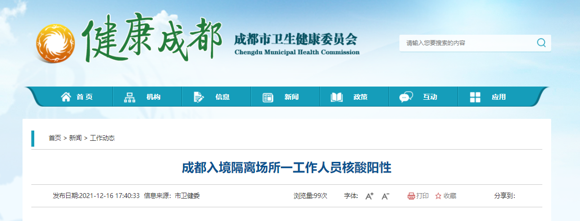 四川成都市衞健委網站消息,12月16日成都市對入境人員集中隔離場所工作人員例行檢測中,發現1例新冠肺炎確診病例。